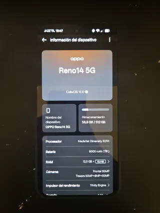 Se vende Oppo Reno 14 5G 12/512 (version europea) Móvil casi nuevo. 2 meses de uso. Ningún golpe ni ralladura. Solo el protector de pantalla tienes pequeñas marcas del dia a día Garantia en vigor desde el 1 de Octubre (fotos) (3años) Todos los accesorios que se muestra en la imagen - Varias carcasas Cargador Original Oneplus SuperVOOC 80W. Se hacen envío NO NEGOCIABLE