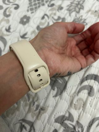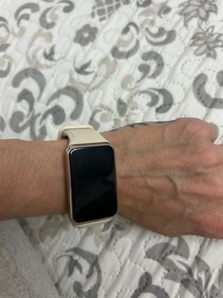 Reloj inteligente con un diseño elegante y moderno. - Correa de color beige.(Muy comoda) - Detalles en tono dorado. - Lo mando en bolsita de terciopelo con el cable de carga, el protector para la pantalla.