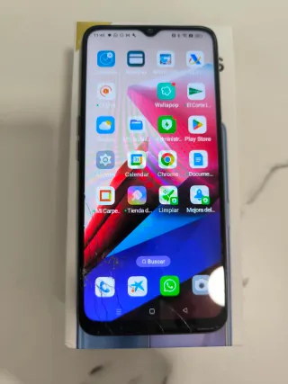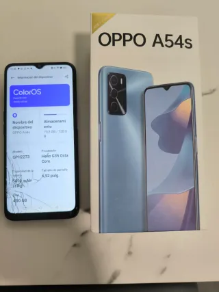 Teléfono móvil OPPO A54s en color negro. La pantalla está rajada, aunque funciona correctamente. - Capacidad de batería: 5000 mAh - Tamaño de pantalla: 6,52 pulgadas - Almacenamiento: 128 GB