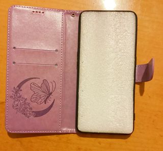 Funda morada, tipo libro, con ranuras para tarjetas en la parte interior y dibujo mariposa. Modelo OPPO 94 5G