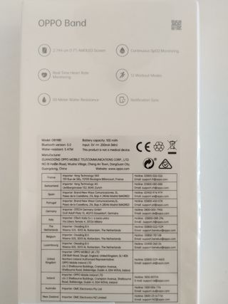 OPPO band sport, SIN ESTRENAR. PRECIO NEGOCIABLE. Caja precintada. Notificaciones de mensajes, llamadas, temporizador, cronómetro, alarmas, informe meteorológico, control del reproductor de música, control de la cámara con un sólo toque y encontrar mi teléfono, control de Sp02, rastrea los niveles de oxígeno en la sangre y proporciona registros de la calidad y duración del sueño, control de frecuencia cardíaca, con 12 modos de ejercicio, un sensor de aceleración registra la duración del ejercicio, la distancia y calorías quemadas. Batería larga duración, una sola carga dura hasta 12 días. Resistente al agua.