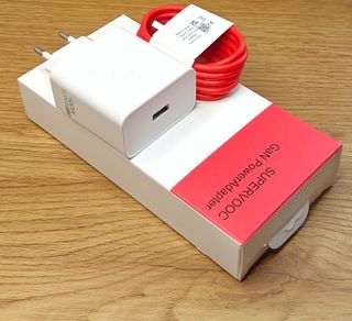 Cargador rápido compartible OnePlus/OPPO/Realme SUPERVOOC de 80W con cable. - Tecnología SUPERVOOC. - Incluye cable de carga. - Diseño blanco y rojo. Compatible, no original. Marca indicada solo para compatibilidad.