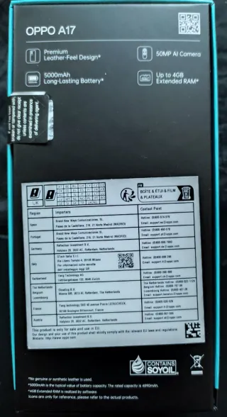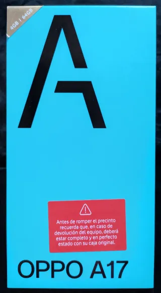 Teléfono móvil OPPO A17 de color negro. - Pantalla 6,56" LCD - Dual SIM - 4 GB RAM - 64 GB de almacenamiento - Cámara 50 MP - Batería 5000 mAH Sin estrenar. Conserva el protector de pantalla intacto. Precinto únicamente abierto para mostrar el móvil en imágenes.
