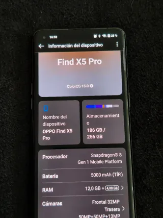 Teléfono móvil Oppo Find X5 Pro con gran capacidad de almacenamiento y memoria RAM. - 12 GB de RAM. - 256 GB de almacenamiento interno. - Procesador Snapdragon 8 Gen 1. - Batería de 5000 mAh. - Cámara frontal de 32MP y trasera de 50MP+50MP+13MP. - ColorOS 15.0.
