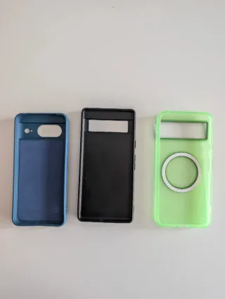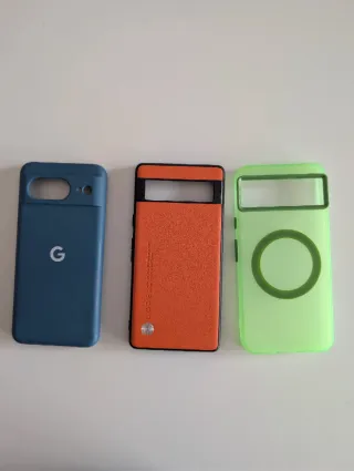 Tres fundas carcasa para Google Pixel 8 nunca usadas - Funda azul con logo de Google. - Funda naranja con textura. - Funda verde translúcida con anillo magnético.