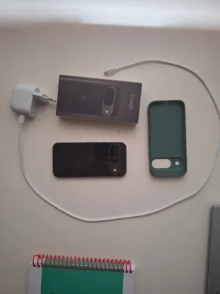 Teléfono móvil Google Pixel 9 con gran capacidad de almacenamiento y accesorios. - Funda protectora de color verde. - Cargador blanco. Comprado en Amazon en julio'25. Tiene garantía y factura