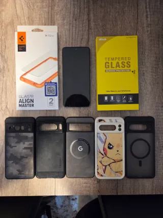 Teléfono móvil Google Pixel 8 Pro con 128GB de almacenamiento. Incluye varios accesorios para protegerlo y mejorar su uso. - Funda protectora con diseño de camuflaje. - Funda protectora Spigen negra. - Funda protectora negra con logo de Google. - Funda protectora con diseño de Pikachu. - Funda protectora negra con MagSafe. - Protector de pantalla Spigen Glas.tR Align Master (2 unidades). - Protector de pantalla JETech Tempered Glass.