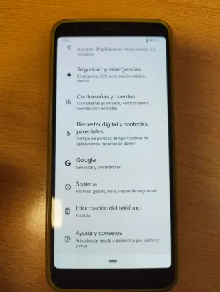 Android con un diseño elegante y funcional. Sin cargador. Carga por USB-C Funda original. Como nuevo. - SIM y compatible eSIM - Vídeos en 4K calidad de imagen sobresaliente. - Procesador Snapdragon 670 de ocho núcleos. 4gb de memoria RAM de 2.0GHz. - 5,6 pulgadas, Resolución 2220 x 1080 pixel, pantalla táctil - Almacenamiento 64GB - Cámara trasera con una resolución de 12,2 Megapixeles y 8 la delantera. - Pantalla OLED y lector huella digital trasero. - Conector auriculares (jack 3,5 mm). - Peso de 350 Gr Tamaño 7 x 0,8 x 15,1 centímetros Color Negro - Batería Li-Po 3000 mAh no extraíble - Pixel 3a - Negro -Almacenamiento: 64 GB
