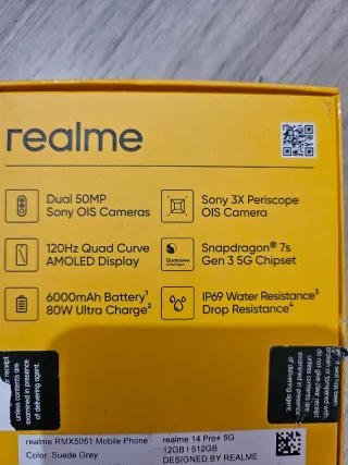 Teléfono móvil realme 14 Pro+ en color gris + cable de carga + case protector. *SIN USO *Abierto para probar funcionamiento. *Versión Global. *12 GB de memoria RAM. *512 GB de almacenamiento interno. Cuenta con el primer sistema de triple flash del sector. Tres tonos diferentes de blancos que se entremezclan para un resultado perfecto. Diseñado para una potencia duradera Tiene una batería de 6000 mAh, lo que te permite tener batería para todo el día. Teléfono móvil con una estabilidad superior. CPU potente + excelente control de temperatura. Chipset Snapdragon® 7s Gen 3 5G Área de refrigeración VC más grande del segmento 120 fps.