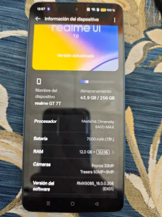 Teléfono móvil Realme GT 7 T. -Pantalla Amoled de 6.88, 1.5K (2.800 * 1.200) -Procesador Media Tek Dimensity 8.400-Max -12GB RAM + 256 GB ROM. -Doble cámara trasera de 50+8, Vídeo 4K. Cámara delantera de 32Mpx. -Android 16 con Realme UI 7.0 -Dual Nano Sim, eSim -Bateria 7.000 mAh, con carga rápida 120W Supervooc., una de las baterías más grandes en la actualidad. -Next AI ( inteligencia artificial con traductor, cámara, planificador etc)