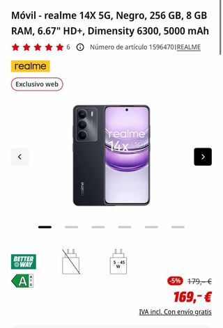 Teléfono móvil Realme 14x 5G en color Carbon Black PRECINTADO, SIN ABRIR -Pantalla Eye Comfort 120Hz 6.67" HD+ -Cámara trasera triple 50Mpx -Procesador Dimensity 6300, -256GB almacenamiento -8GB RAM -Batería 5000mAh -Dual SIM -Conectividad 5G # telefono movil android barato sin usar nuevo xiomi 128 256 512 samsung android realmi realme