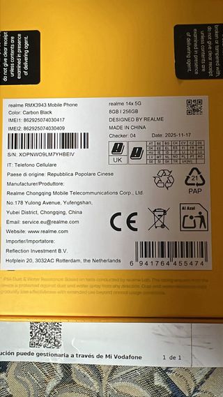 Rebajado!!! Teléfono móvil Realme 14X 5G en color negro y con gran capacidad de almacenamiento. - Pantalla de 6.74 pulgadas. - Cámara principal de 108 MP. - Batería de 5000 mAh. - Cámara trasera de 50 mpx - Triple cámara movil totalmente nuevo, a estrenar. Precintado, como se puede ver en las fotos clave: iPhone samsung android lg xiaomi