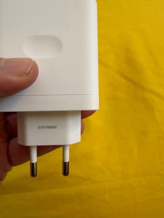 Cargador rápido original Realme con tecnología SuperVOOC. - Potencia de 120W. - Diseño compacto y blanco. - Sin cable, solo cargador original