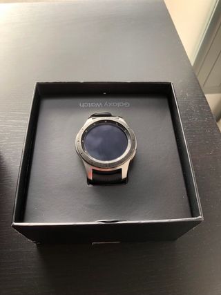 Reloj inteligente Samsung Galaxy Watch en caja. - Diseño elegante en plata y negro. - Incluye caja original, cargador y correa de repuesto de menor tamaño. Modelo SM-R800