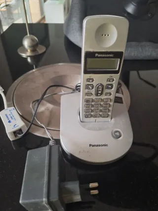 Teléfono inalámbrico de la marca Panasonic. Instalación en la pared o sobre la mesa - Color gris plateado. - Incluye base y cargador.