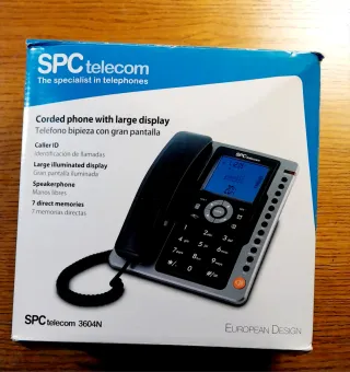 (Tengo 2 unidades. Este anuncio y precio es de 1 unidad. Si te interesan los 2 , serían 15€ los 2) Teléfono fijo de sobremesa SPC 3604N Office Pro. - Pantalla grande iluminada. - Identificador de llamadas. - Manos libres. - 7 memorias directas. Es un teléfono analógico con un diseño sólido, ideal para oficinas. Ofrece identificación de llamadas y lista de 99 posiciones de llamadas recibidas. Se puede utilizar tanto sobremesa como mural.