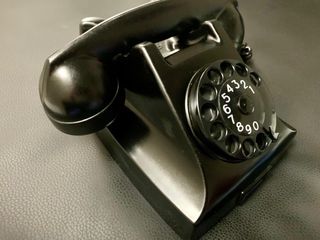 Se trata de un teléfono de baquelita negro con dial giratorio. Modelo 5532 A. El disco gira pero no vuelve por sí solo. El número 4 está dañado, se ve en fotografía. La campana o timbre suena al colgar y descolgar. Diseño vintage.