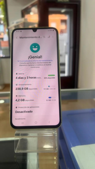El precio mostrado es el de venta en nuestra tienda. El precio de este producto en nuestra página web puede ser diferente. Este artículo está disponible en nuestra tienda de Valencia. samsung galaxy a56 5g 8gb 256gb CC005_E976284_0 es un objeto que se ofrece en estado excelente. Todos nuestros productos cuentan con garantía de 3 años y un plazo de devolución de 14 días. Cable cargador: No | Informacion adicional: Cargador compatible, no original. signos de uso no apreciable en las imágenes. | Caja original: No | Sistema operativo: Android | 3g: 5g | Memoria ram: 8 | Megapixels: 50 | Operador: Libre | Capacidad: 256 | Pulgada
