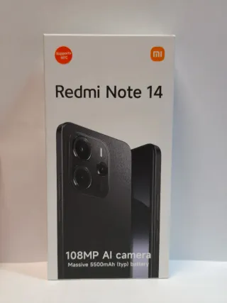 Teléfono móvil Xiaomi Redmi Note 14 en color negro, con 256GB de almacenamiento y 8GB de RAM. El dispositivo está precintado y es completamente nuevo. - Soporta NFC. - Cámara principal de 108MP con IA. - Batería masiva de 5500mAh (típica).