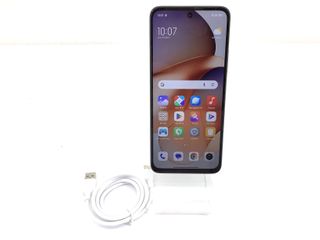 Teléfono móvil Xiaomi Redmi Note 14 5G. 256GB de almacenamiento. Muy poco uso. Restablecido de fábrica. - Pantalla con notch. - Logo de Xiaomi en el centro. - Indicador de carga en la parte inferior.