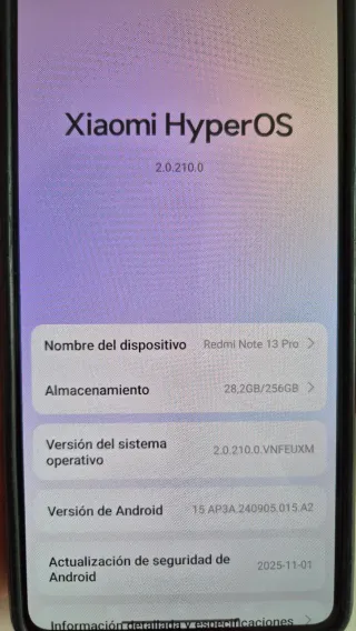 Teléfono móvil Xiaomi Redmi Note 13 Pro en perfecto estado. Listo para usar. - Modelo: Redmi Note 13 Pro - Capacidad de almacenamiento: 256GB - Versión de Android: 15 *SIEMPRE SE HA USADO CON FUNDA POR LO CUAL NO TIENE DETALLES DE GOLPES NI NADA