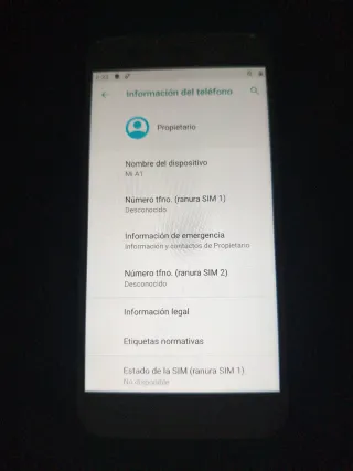 Teléfono móvil Xiaomi Mi A1. - Nombre del dispositivo: Mi A1. - Número de teléfono (ranura SIM 1): Desconocido. - Número de teléfono (ranura SIM 2): Desconocido. - Estado de la SIM (ranura SIM 1): No disponible.