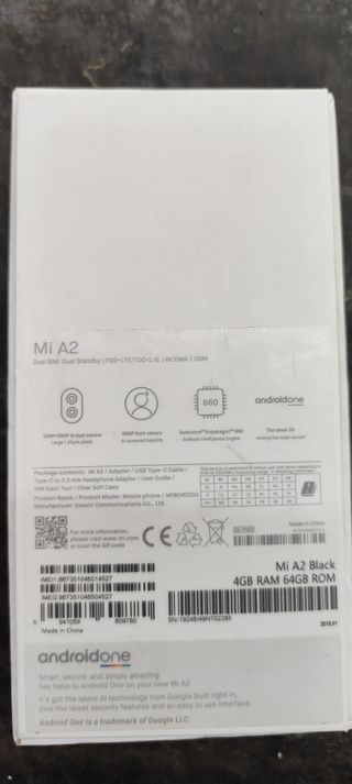 Teléfono móvil Xiaomi Mi A2 en color negro en muy buenas condiciones. - Pantalla de 5.99 pulgadas. - Cámara dual trasera de 12MP + 20MP. - Cámara frontal de 20MP. - Procesador Snapdragon 660. - 64 Gb de memoria. - Batería de 3010 mAh.