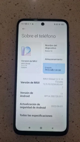 Teléfono móvil Xiaomi Redmi 10 en color gris. - Modelo: Redmi 10 - Capacidad: 128 GB - Color: Gris Carbón - Versión MIUI: 12.5.10 Estable - Versión Android: 11 - Actualización de seguridad: 2022-06-01