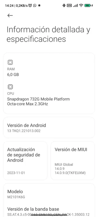 Teléfono móvil Redmi 9AT en color gris. - Almacenamiento interno de 32 GB. - Versión de MIUI Global 12.5.6 Estable. - Actualización de seguridad de Android con fecha 2022-09-01. En las fotos se aprecia el protector de pantalla en mal estado y no tiene cargador