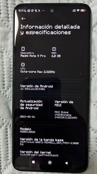 Teléfono móvil Xiaomi Redmi Note 9 Pro en color negro. - Pantalla de 6,67 pulgadas. - Procesador Octa-core. - 6 GB de RAM. - 64 GB de almacenamiento interno. - Versión de Android 12. - Versión de MIUI 14.0.5 Estable.