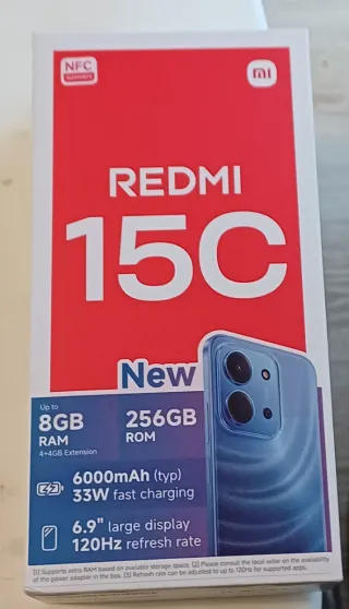 Teléfono móvil Xiaomi Redmi 15C 5G, completamente nuevo y en su caja original. - Pantalla grande de 6.9 con tasa de refresco de 120Hz. - Batería de 6000mAh (típica) con carga rápida de 33W. - Hasta 8GB de RAM con extensión de 4GB. - Almacenamiento interno de 256GB ROM.