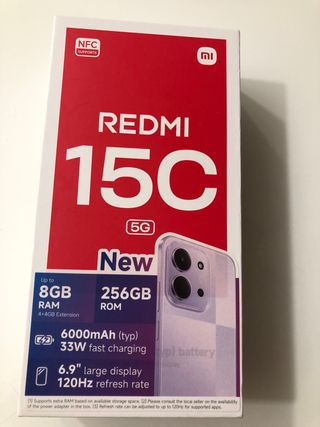 Teléfono móvil Xiaomi Redmi 15C 5G, nuevo a estrenar. - Pantalla grande de 6.9 con 120Hz de tasa de refresco. - Batería de 6000mAh (typ) con carga rápida de 33W. - Hasta 8GB de RAM (4+4GB de extensión). - Compatible con NFC.