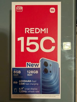 Teléfono móvil Redmi 15C a estrenar, con un diseño moderno y elegante. - Pantalla grande de 6.9 con 120Hz de tasa de refresco. - Batería de 6000mAh (typ) con carga rápida de 33W. - Admite hasta 8GB de RAM con extensión de 4+4GB. - Almacenamiento interno de 128GB ROM. - Compatible con NFC. No hay fotos del móvil porque la caja está sin abrir (foto de que está precintado)