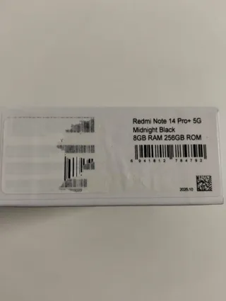 Teléfono móvil Xiaomi Redmi Note 14 Pro+ 5G en color negro y con 256GB de almacenamiento. - Modelo: Redmi Note 14 Pro+ 5G - Color: Midnight Black - Memoria RAM: 8GB - Almacenamiento ROM: 256GB - Conectividad: 5G - Fecha de fabricación: 2025.10