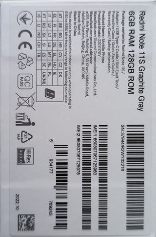 Teléfono móvil Xiaomi Redmi Note 12 en color azul. - Modelo 2201117TY. - Fabricado por Xiaomi Communications Co., Ltd. - Etiqueta de certificación CE.