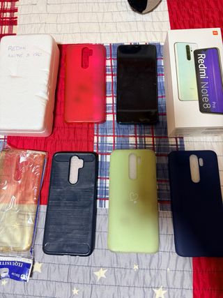 Lote de fundas y protector de pantalla para Xiaomi Redmi Note 8 Pro. - Funda roja translúcida. - Funda azul marino. - Funda verde claro con corazón. - Funda negra texturizada. - Protector de pantalla transparente. Redmi Note 8 Pro 6 Gb RAM 128 Gb ROM. Se entrega con fundas, protectores de pantalla de repuesto (anti espia) y su caja original.