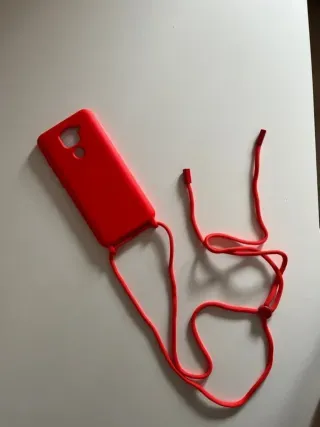 Funda de silicona en color rojo para Xiaomi Redmi Note 9. Incluye una cuerda ajustable para llevar el móvil colgado. Comprada por error para Redmi Note 9S.