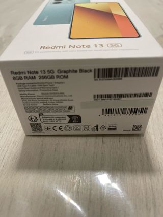Teléfono móvil Xiaomi Redmi Note 13 5G en color negro, con 256 GB de almacenamiento. - Nuevo a estrenar. - Incluye dos fundas. - Protector de cristal puesto.