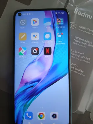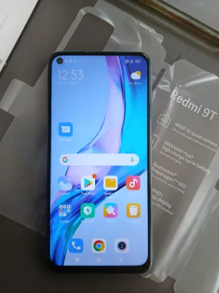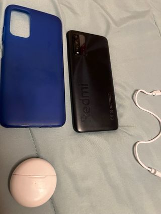 Teléfono móvil Xiaomi Redmi 9T en color negro, junto con: - Funda protectora azul. - Auriculares inalámbricos blancos sin usar y cable de carga blanco. El móvil solo se ha utilizado en casos de emergencia de que otro móvil no funcionase. Apenas tiene uso.