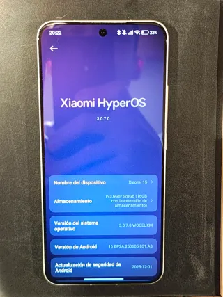 Teléfono móvil Xiaomi 15 con sistema operativo HyperOS. - Modelo: Xiaomi 15 - Capacidad de almacenamiento: 512GB - Versión del sistema operativo: 3.0.7.0.WOCEUXM - Versión de Android: 16 BP2A.250605.031.A3 - Actualización de seguridad de Android: 2025-12-01