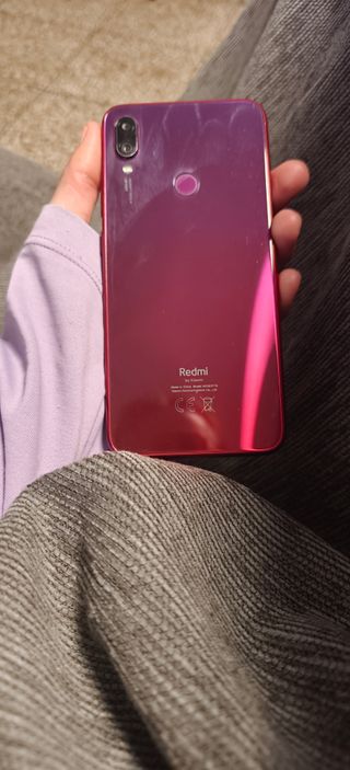 Teléfono móvil Xiaomi Redmi Note 7 con un acabado degradado entre morado y rojo. Tiene protector de pantalla, la suya está perfecta - Cámara dual trasera. - Sensor de huellas dactilares en la parte posterior. - Diseño elegante y moderno.