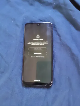 Teléfono móvil Xiaomi en color negro. - Pantalla con bloqueo de dispositivo. - Requiere contraseña para verificar la cuenta Mi. - Opción de activar dispositivo. - Acceso a ajustes de Wi-Fi. - Código de desbloqueo: 4TRO-VBCJ-K7UN-XQ6.