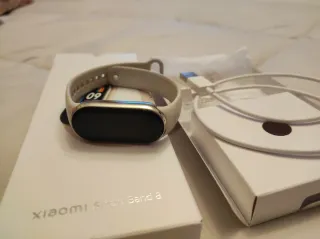 Pulsera inteligente Xiaomi Smart Band 8 en color beige y plata. Incluye su cargador. - Diseño elegante y moderno. - Correa original ajustable.