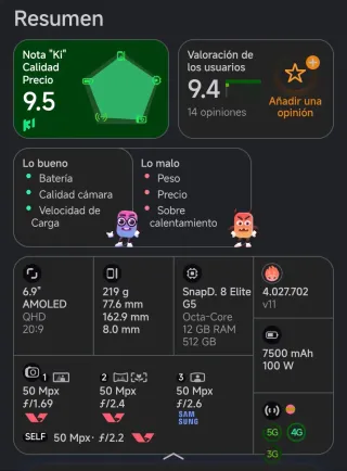 El precio mostrado es el de venta en nuestra tienda. El precio de este producto en nuestra página web puede ser diferente. Este artículo está disponible en nuestra tienda de Badajoz. xiaomi 15 ultra 16gb 512gb CC064_E388411_0 es un objeto que se ofrece en estado excelente. Todos nuestros productos cuentan con garantía de 3 años y un plazo de devolución de 14 días. Caja original: Si | Sistema operativo: Android | 3g: 5g | Memoria ram: 16 | Megapixels: 50 | Marca: Xiaomi | Operador: Libre | Capacidad: 512 | Color: Negro | Pulgadas: 6.73 | Modelo: 15 ultra 16gb 512gb | Cable cargador: Si | Numero de sim: 2 (dual-sim) | Informaci