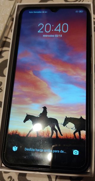 Teléfono móvil Xiaomi Redmi 9. - Color negro y verde. - Pantalla con muesca para cámara frontal.