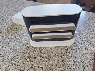 Estación de carga con un diseño moderno y elegante. - Acabado superior blanco. - Cuerpo principal con textura oscura. - Dos ranuras frontales con detalles plateados.