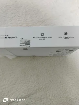 Teléfono con sistema operativo HyperOS. - Procesador MediaTek Dimensity 6300 con 5G. - Cámara dual AI de 50MP. - No aceptar si el sello está roto.
