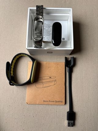 Pulsera inteligente Xiaomi Mi Band 3. - Incluye pulsera de eslabones plateada. - Incluye pulsera negra con detalles amarillos. - Incluye cargador. - Incluye protectores de pantalla. La pulsera no ha tenido apenas uso, está cargada al completo y se enciende como se aprecia en la foto, pero luego no responde al dedo cuando la pulsas de ahi su precio. Si la llevas a Xiaomi ya me dijeron que tiene arreglo y que no cuesta mucho. Cualquier duda aquí estoy para resolvérsela.