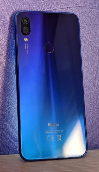 Teléfono móvil Xiaomi Redmi 7 en llamativo color azul degradado. - Cámara dual trasera de 48MP con IA. - Sensor de huellas dactilares en la parte trasera. - Diseño elegante y moderno.