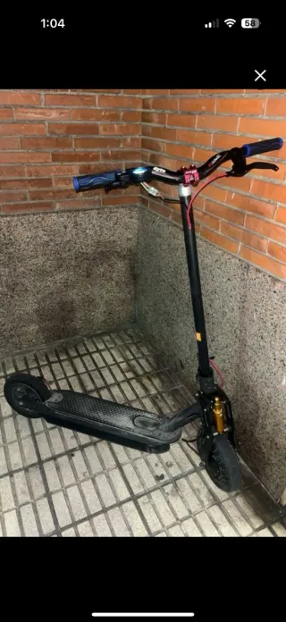 Patinete eléctrico Xiaomi con varias modificaciones. Motor smartguro pro 1200w Manillar de bici Jp 60v 25ah Batería 60v 20ah Suspensión monorim Potencia monorim Aplicación y cargador 2ah - Manillar personalizado con puños azules. - Detalles en color rojo en la potencia y frenos. - Rueda delantera con llanta dorada.